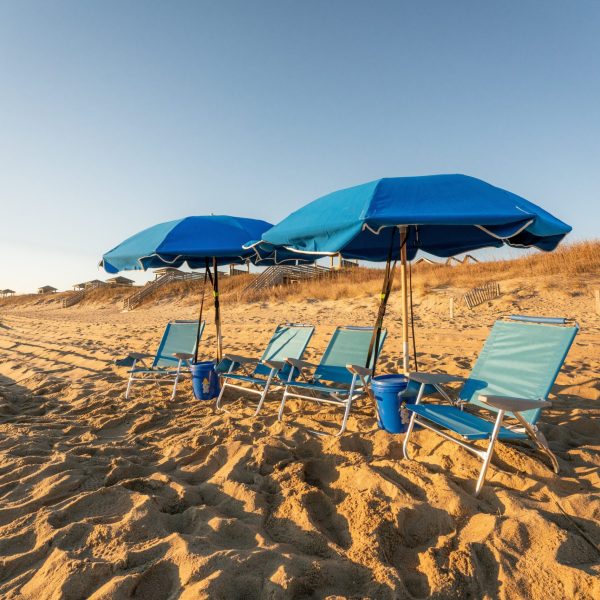 Our beach umbrella and chair rental service features high-quality, well-maintained umbrellas and chairs. Each day of your rental period, we set up 7.5-foot umbrellas made with fiberlite ribs and wooden poles, plus two beach chairs and an anchor system that secures your umbrella to the beach.